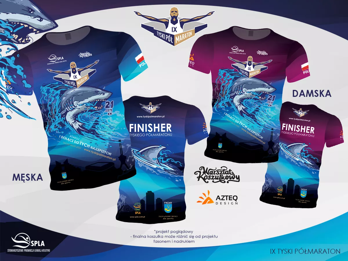 „Koszulka wiadomo nie byle jaka bo techniczna, oddychająca i zadrukowana fullprint'owo - do biegania i lansowania się na mieście ! Kolorek dla niej i dla niego - a na przodzie nasz rekin atakujący 21 km !!!! Dołączysz do niego?”