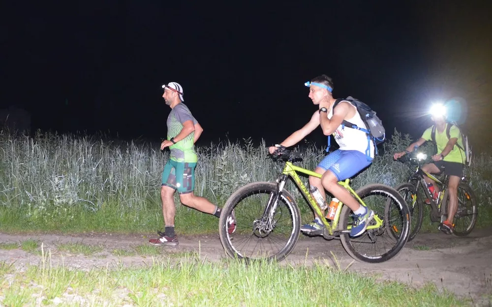 "Gdy znudzi ci się bieganie po pętli kilometrowej (tu odniesienie do organizowanego w Dąbrowie Górniczej biegu 24 godzinnego DG24h - red.) można zrobić pętle 100 km! Do tego paru świrów, kilka rowerów i wychodzi fajna zabawa. Zasada prosta 3-osobowa drużyna, dwa rowery, jedna osoba zawsze biegnie. Start o 20:00. Niby fajnie bo na rowerze można odpocząć. Ale nie jak się jedzie po pustyni, albo w błocie po kostki,i to pod górkę, o 3 w nocy. Wystartowało 7 drużyn, ukończyło 5. Nam udało się dobiec na 2. pozycje, niestety nie zmieściliśmy się w limicie 10 godzin - 10:32:55. Do tego burza na trasie, dziki, robale i pełno błota. Bo bieganie jest fajnie!"