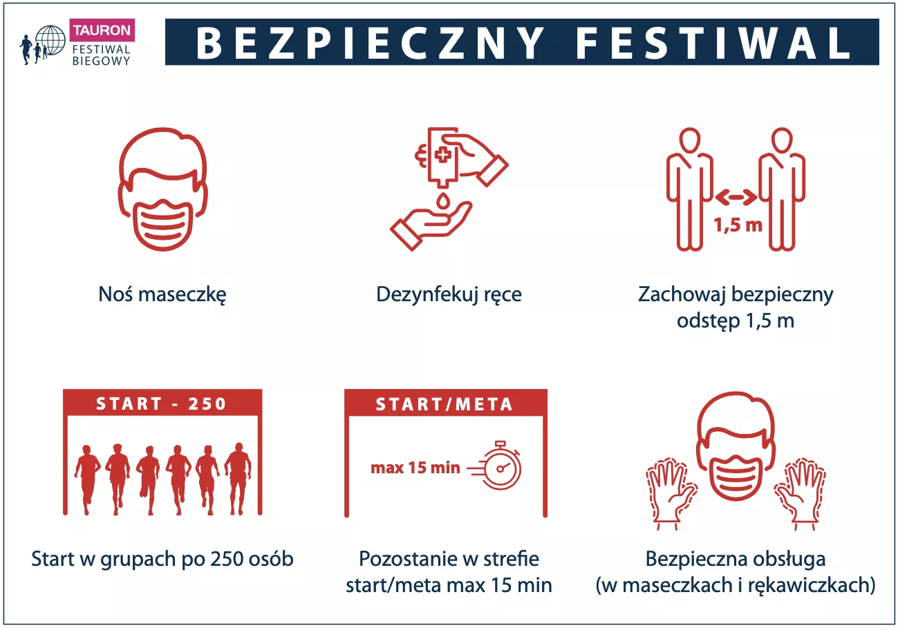 Pandemia COVID-19 i wprowadzone restrykcje sanitarno-epidemiologiczne mają bezpośredni wpływ na logistykę 11. TAURON Festiwalu Biegowego. Celem wprowadzonych działań jest zminimalizowanie ryzyka zakażeń koronawirusem podczas imprezy.