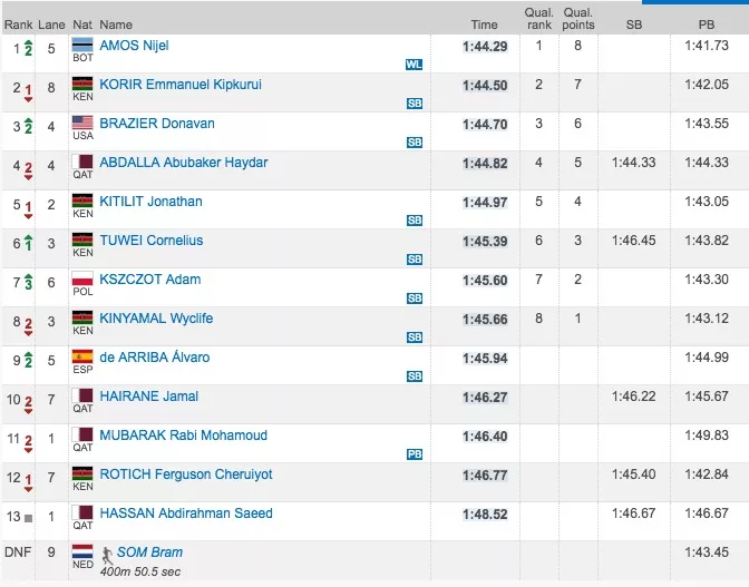 Adam Kszczot w swoim pierwszym starcie w sezonie zajął w Dosze siódme miejsce z czasem 1:45.60. Po szybkim i bardzo wyrównanym biegu wygrał reprezentant Botswany Nijel Amos - 1:44:29.