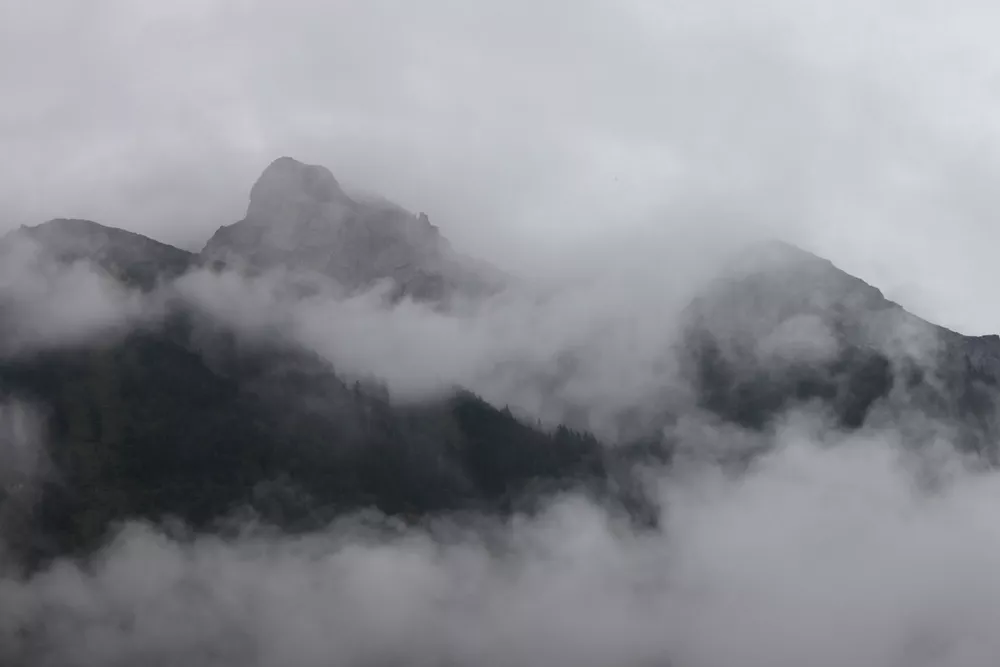 Zbieg kończy się wbiegnięciem do St. Niklaus. Patrzę w lewą stronę i już wiem, ależ tak, to lekko schowany w chmurach Matterhorn. Wow, ale on majestatyczny i wyniosły. Dosyć jednak zachwytów, na przód. Zbiegam najpierw na sam dół doliny, a następnie chwila asfaltem. Można wreszcie pobiec trochę po płaskim. Następnie zaczynam ostre podejście, coraz wyżej i wyżej aż do Jungen (1964 m n.p.m.) małej wioseczki zawieszonej prawie w chmurach, gdzieś między ziemią a niebem.