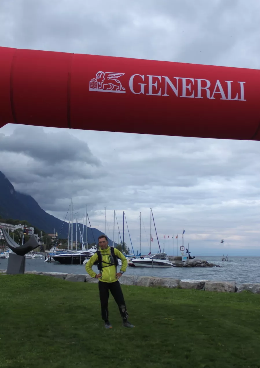 Wybiegam jednak już z lasu. Góry już za mną. Teraz jeszcze ostanie 2 km. po płaskim, wzdłuż kanału do portu nad jeziorem genewskim. Mam lekki problem ze zlokalizowaniem mety, jednak dobra kobieta z volkswagena podprowadza mnie jadąc w pobliżu. Tuż przed portem wyskakuje z samochodu i pokazuje metę. Macham do niej z podziękowaniami i pędzę do przodu.