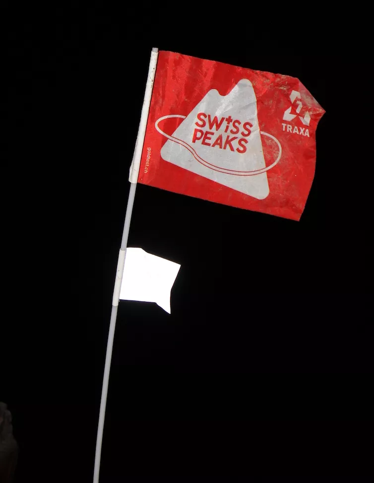 Po jedzeniu, trochę ociężały wychodzę na trasę w ciemną noc żegnany okrzykami miejscowych. Dobrze, że się wyrwałem. Tam było tak pięknie i gościnie. Zwłaszcza, że gospodarze zachęcali, że na górze mają przygotowane miejsca do spania. Napieram z lekko przeciążonym brzuchem, ale za to jaki szczęśliwy. Droga wiedzie od chorągiewki do chorągiewki. Znowu wyżej i wyżej aż na wysokość 2824 m n.p.m. Następnie zbieg w dół aż do grani, która ma mnie doprowadzić do Zinal, na kolejny przepak. Po drodze kilkukrotnie się potykam i prawie przewracam. Noc, zmęczenie, a długi zbieg wysysa ze mnie wszelką ochotę na dalsze zmagania. Widać, że potrzebuję oddechu i chwili wytchnienia.