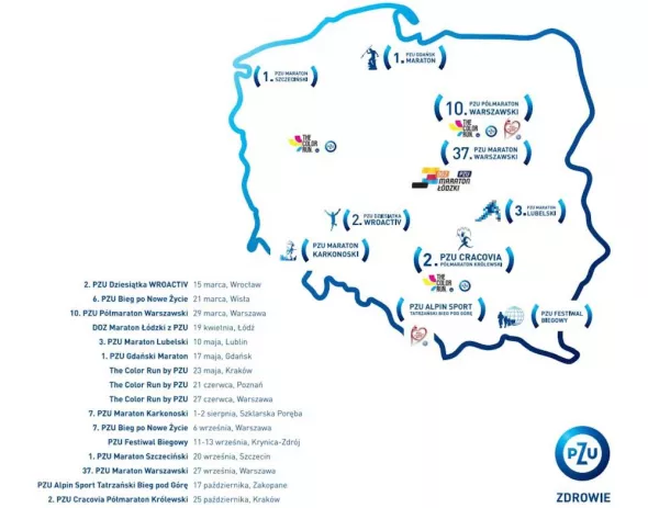 Nowością jest współpraca PZU z cyklem parkrun Polska, czyli cotygodniowymi biegami na 5 km organizowanymi już w ponad 20 miastach, a także cykl The Color Run, największa na świecie seria imprez biegowych, która w tym roku zawita do naszego kraju. Możemy się też spodziewać widowiskowych maratonów – w Łodzi (19 kwietnia), w Lublinie (10 maja) oraz w Karkonoszach (2 sierpnia).