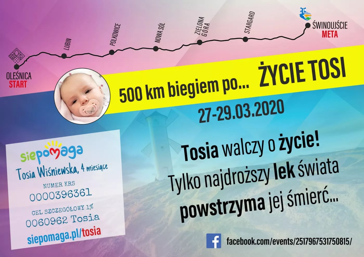 Tosia urodziła się ze SMA (rdzeniowym zanikiem mięśni). Chorobę można kontrolować lekiem. Jej rodzice mają jednak nadzieję na dostęp do innowacyjnej terapii, która mogłaby diametralnie zmienić ich sytuację. Niestety koszt takiej terapii jest niebotyczny. Tosi zanikają mięśnie, rodzice walczą o stan jej zdrowia, a biegacze z „Biegiem Po Marzenia” postanowili użyć własnych mięśni, by nagłośnić zbiórkę charytatywną.
