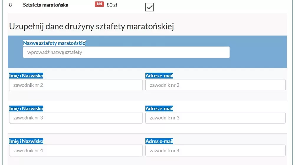 CAŁĄ sztafetę zgłasza jej kapitan. Po zaznaczeniu w formularzu rejestracyjnym pozycji „Sztafeta Deptaka” lub „Sztafeta Maratońska”, rozwiną się pola dodatkowe, w które kapitan wpisuje nazwę sztafety i podaje podstawowe dane 3 pozostałych zawodników zespołu (imię, nazwisko, adres mailowy).