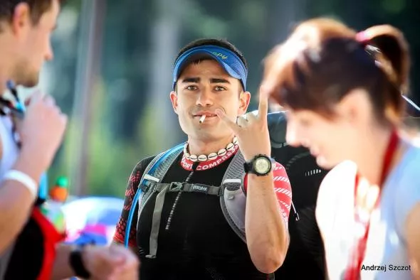Kolejny przepak. Teraz już na spokojnie. Siadam na betonowym bloku leżącym na trawie i wylewam zawartość dwóch butelek z wodą na głowę. Jest już ponad 20 stopni. Czuję, że nogi są już bardzo zmęczone. Szczególnie lewa, na której mam założoną ortezę. Staw skokowy, który miałem złamany dwukrotnie jest teraz bardzo wrażliwy na taki wysiłek. Czuję dość znaczny ucisk na prostownik dużego palca, ale nie luzuję sznurowadeł. Pomogłoby to na podbiegach, ale na zbiegach odwróciłoby się przeciwko mnie. Kilka dobrych minut spędzam w towarzystwie żony, do której mówię, że kolejny etap chyba będzie ostatnim. Moją i Magdy uwagę przyciąga niezwykła prośba „Ma ktoś może papierosa? Dajcie cygara, bo mi dziewczyna z wszystkich przepaków powyciągała!” – mówi z uśmiechem na twarzy jeden z grupki biegaczy siedzących nieopodal. Rozbrzmiewa gromki śmiech wszystkich, którzy to słyszeli.