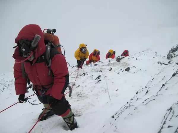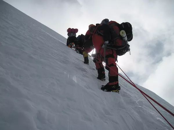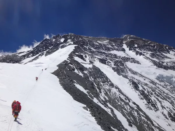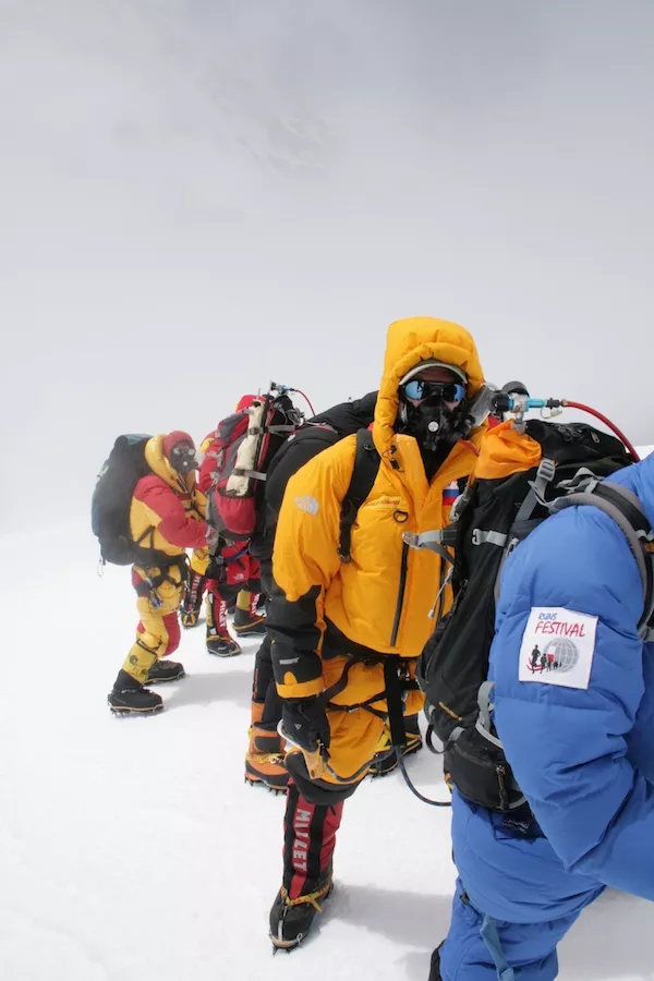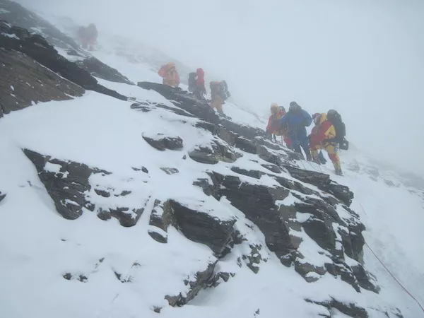 Droga do obozu na wysokości 7700m n.p.m. Ponieważ okno pogodowe (czas kiedy pogoda pozwala na wejście na szczyt) w tym roku trwało tylko półtora dnia, dlatego tak łatwo było o ten długi wężyk ludzi, którzy szli do góry.