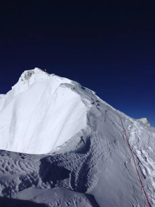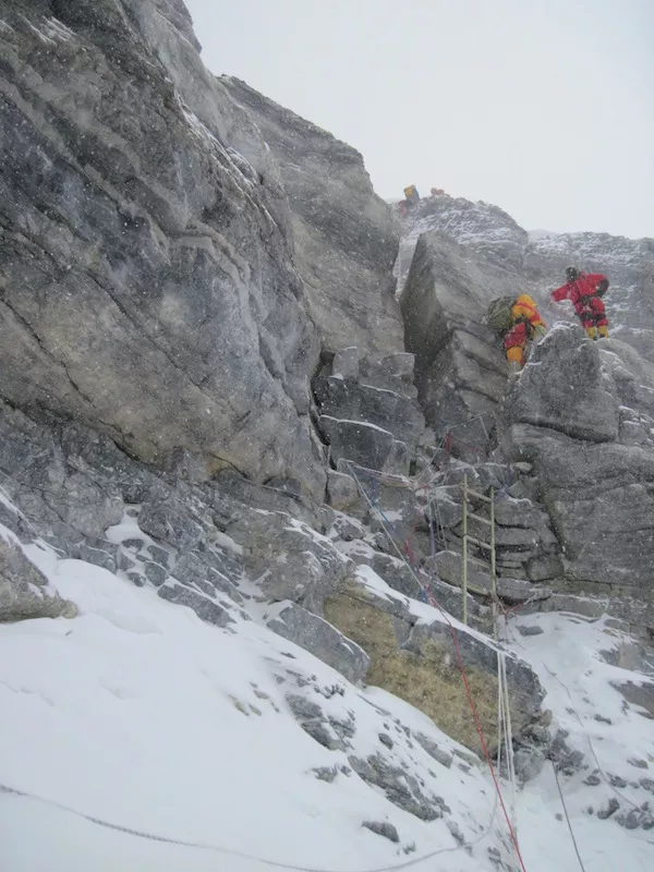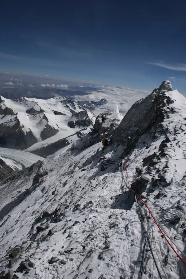 Grań Mount Everestu. Wysokość nie mniej niż 8500m n.p.m. Na zdjęciu widać wiele lin poręczowych – to z poprzednich lat, bo my w tym roku mieliśmy czerwoną.