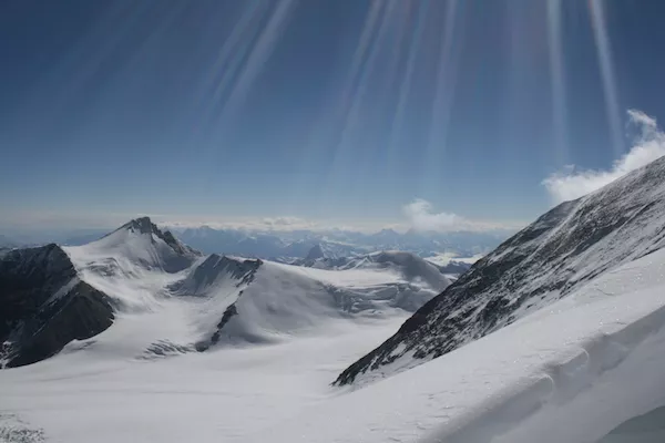 Zdjęcie wykonane z bazy na 7100m n.p.m., zaraz po dotarciu na miejsce. Świeci Słońce, wspaniałe widoki.