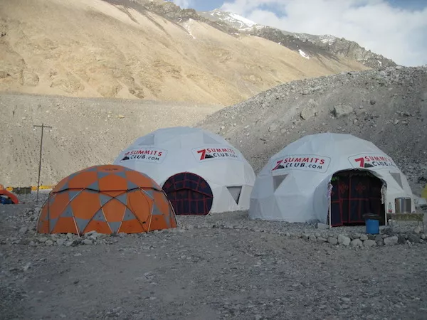 Jeszcze raz najważniejsze namioty naszej bazy na 5300m n.p.m. Największy rekreacyjny, mniejszy jadalnia oraz najmniejszy kolorowy – to namiot komputerowy.