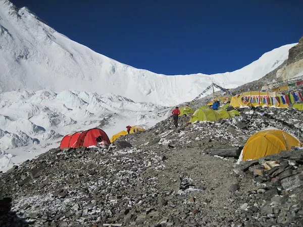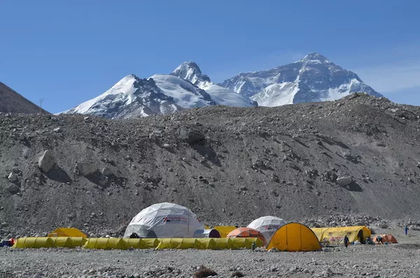 Baza na wysokości 7700m n.p.m. i stróżka ludzi, którzy schodzą z wysokości 7100m n.p.m.