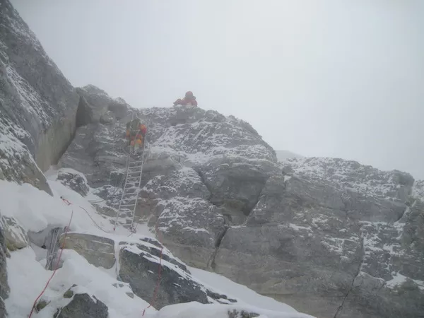 Po drodze na szczyt jest jednak kilka trudnych momentów. Drabina, którą widać na zdjęciu, ma prawie osiem metrów. To, co jest w jej pokonaniu najtrudniejsze, to niesłychanie wąskie szczeble oraz to, że jest ona przymocowana do ściany prawie pionowo (wrażenie ze zdjęcia, że jest inaczej, jest mylne), a na samym końcu trzeba się gimnastykować, aby z niej bezpiecznie zejść.