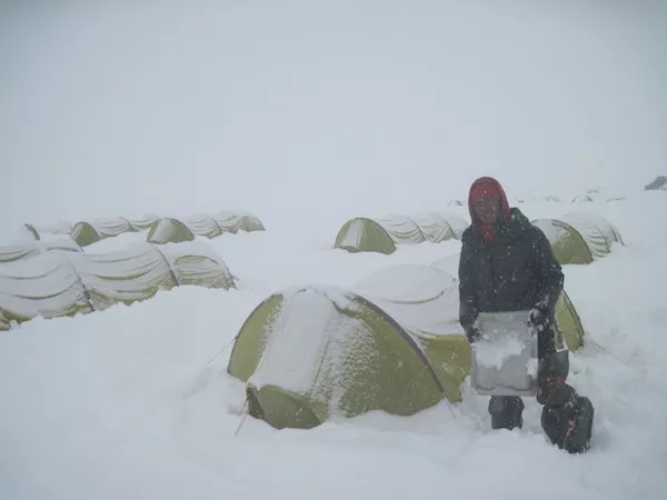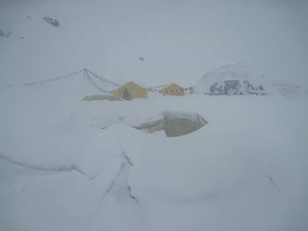 Gdy już wróciliśmy do bazy na 5300m n.p.m., wydawało nam się, że historia się skończyła. Tymczasem przyszedł taki śnieg, że w nocy trzeba było strzepywać go z namiotów, by było czym oddychać i żeby te nasze małe namioty nas w nocy nie przywaliły.