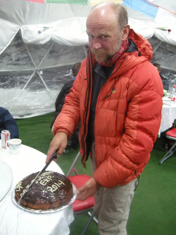 Ostatni dzień pobytu w Himalajach. Jesteśmy już wszyscy w bazie na 5300m n.p.m. i zajadamy się tortem, który przygotował nasz szef kuchni. Jak widać, jest niezłym kucharzem.