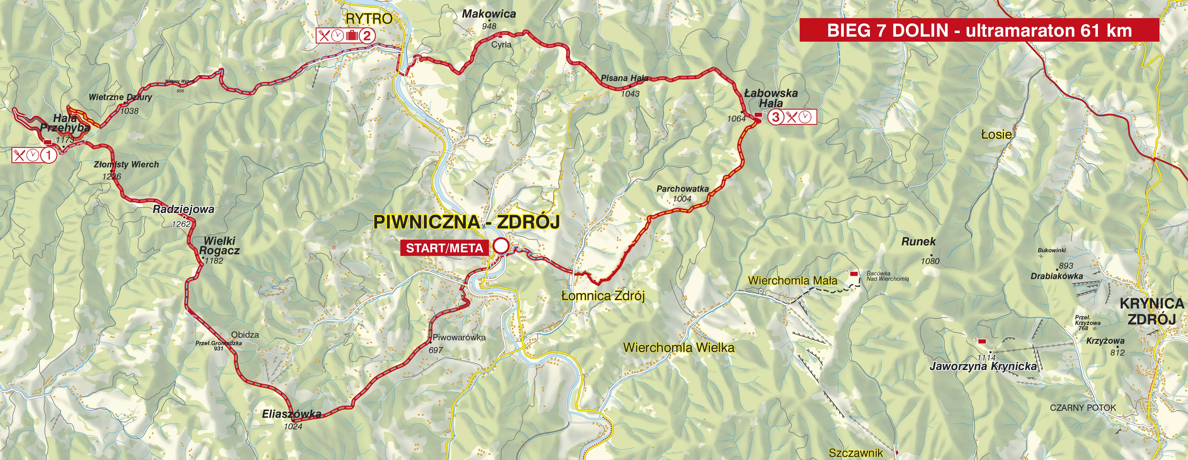 [Start: sobota 11 września o godz. 6] Bieg Siedmiu Dolin 61 km: Start z Piwnicznej-Zdroju (Miasteczko Biegowe) szlakiem zielonym przez Piwowarówkę, Eliaszówkę na Obidzę (Przełęcz Gromadzką) dalej szlak niebieski na Wielki Rogacz później szlakiem czerwonym przez Radziejową, Złomisty Wierch na Przehybę.