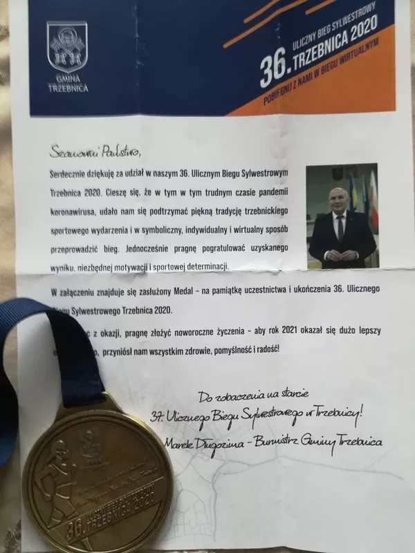 To nie koniec miłych niespodzianek. Bardzo szybko dotarły do nas piękne medale, a pan Marek Długozima burmistrz Trzebnicy dorzucił jeszcze miłe podziękowanie i życzenia na Nowy Rok 2021. Okazuje się, że nawet w czasach pandemii można przygotować wspaniałą imprezę biegową, która zostanie na zawsze w pamięci i niewątpliwie zachęci do startu za rok w tym biegu, oby w samej Trzebnicy.