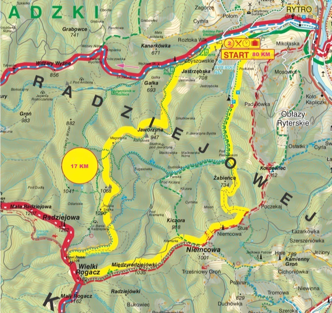 Start ultramaratonu 80 km nastąpi w Rytrze o godz. 4:00. Zawodnicy pobiegną z Rytra trasą Biegu 7 Dolin 64 km. Gdy miną Radziejową i dotrą do Przełęczy Żłobki (1106m n.p.m.), zbiegną w żółty szlak w kierunku Jaworzyny i Rytra. Po odbiciu się na macie pomiarowej przy Hotelu Perła Południa i ewentualnym skorzystaniu z bufetu, wybiegną z Rytra w kierunku Małej Roztoki i dalej Żabieńców. W Niemcowej wbiegną na czerwony szlak, który poprowadzi ich prosto do Wielkiego Rogacza. Tam wrócą na trasę Biegu 7 Dolin. Na pokonanie pełnego dystansu 80 km będą mieli dokładnie 13 godzin.