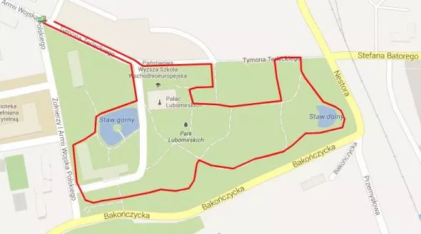 Trasa dla mniej wymagających biegaczy, w bardzo przyjemnej scenerii parku Lubomirskich w Przemyślu przy ul. Żołnierzy I Armii Wojska Polskiego, ul. Bakończyckiej, ul. Nestora i ul. Terleckiego. Pętla liczy ok. 1,5 km. Trasa o bardzo miękkim podłożu, dobrze oświetlona z niewielkimi podbiegami i zbiegami. Idealne miejsce na spokojne przebieżki i rekreację. Polecam!