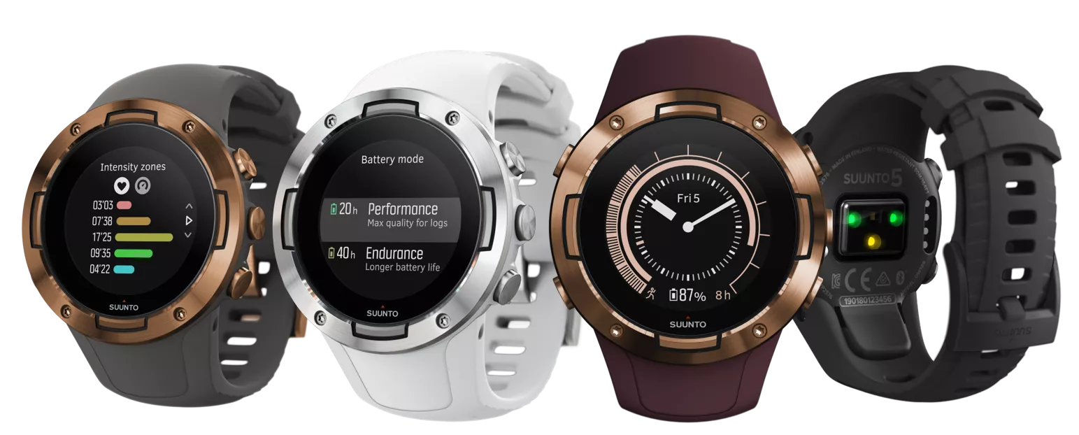 Zegarek Suunto 5 to nie tylko funkcjonalność, ale także styl. Solidny pierścień ze stali nierdzewnej i cztery wersje kolorystyczne – cały czarny, biały, miedź burgundowa i miedź grafitowa – sprawiają, że zegarek jest nie tylko wyrafinowany, ale też podkreśla indywidualizm.