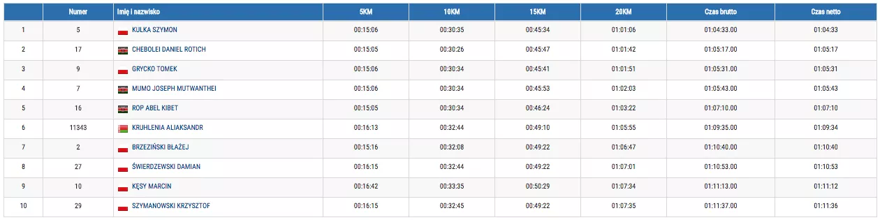 Nic takiego się nie stało i Szymon Kulka pewnie, z wysoko uniesionymi rękami w geście triumfu przekroczył metę w czasie 1:04:33.
