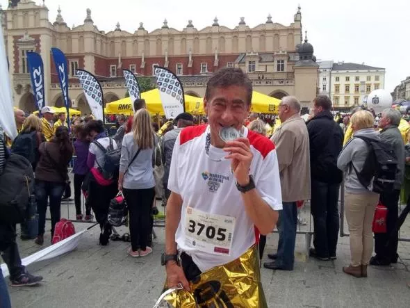 Na 37. kilometrze na krótko przechodzę do marszu. Jakiś gość z tyłu krzyczy „w Rzymie dobiegłeś, a tu nie dajesz rady?” – to mnie mobilizuje. Biegnę już do końca wyścigu. Zbliżamy się do Wawelu, okrążamy go z lewej strony i wpadamy w ul. Grodzką. Stąd już prosta droga na Rynek. W perspektywie ulicy widać w dali dachy Sukiennic.