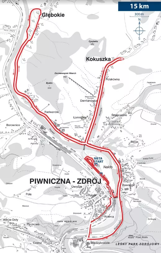 Uczestnicy Biegu 15 km wystartują z Miasteczka Biegowego na Nakle, pobiegną przez centrum Piwnicznej ulicą Targową, później ulicą Kazimierza Wielkiego przez most na Popradzie, przebiegają chodnikiem po lewej stronie przez most, skręcą w ulicę Kościuszki.
