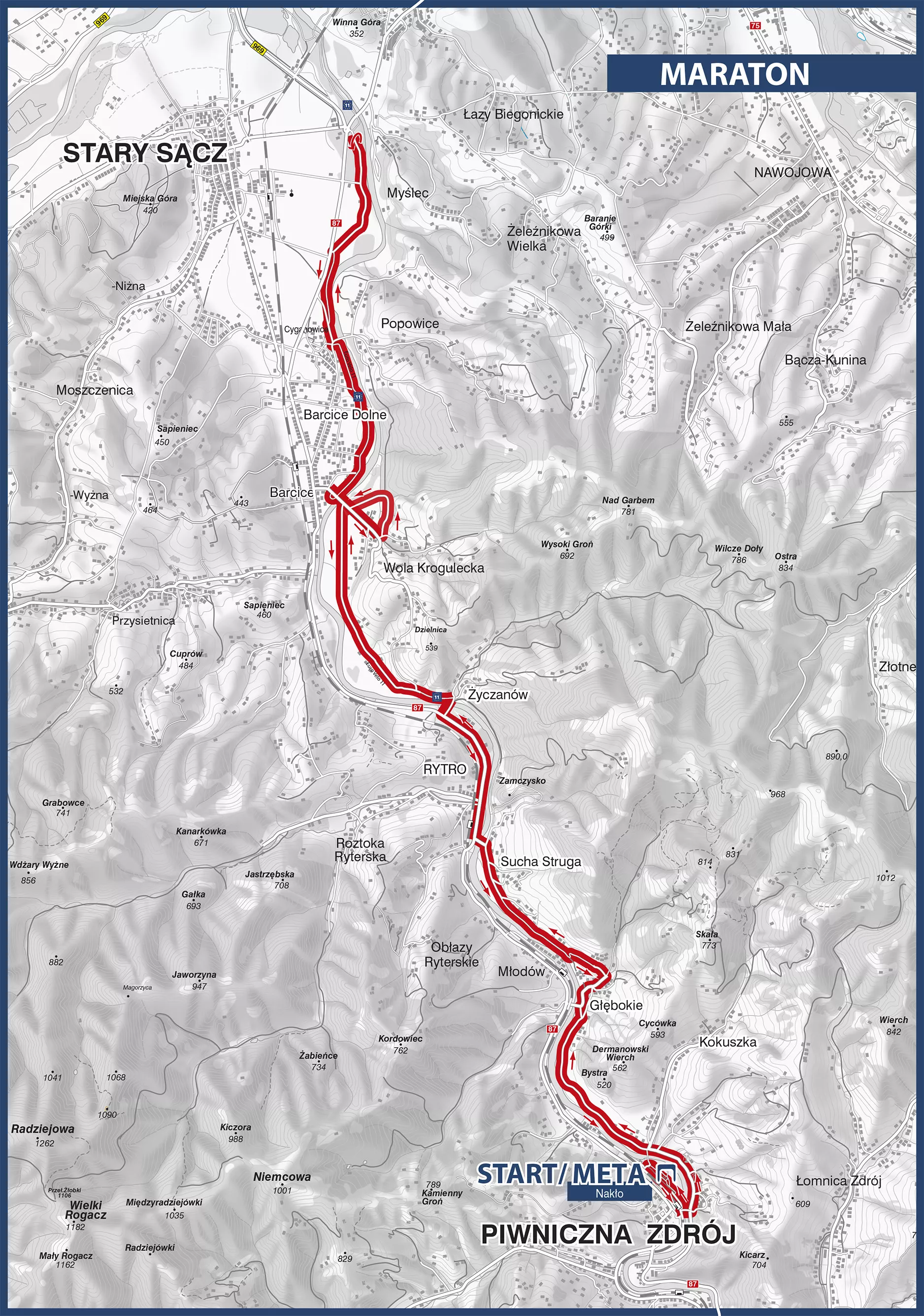Na trasie Koral Maratonu, w stosunku do wcześniejszych założeń, też nastąpiła mała zmiana - po starcie w Miasteczku Biegowym na Nakle, zamiast w Starym Sączu, nawrót nastąpi już w Barcicach. Ze względu na to, musieliśmy dodac dodatkowy odcinek - przed mostem nastąpi obieg dookoła osiedla Kącina.