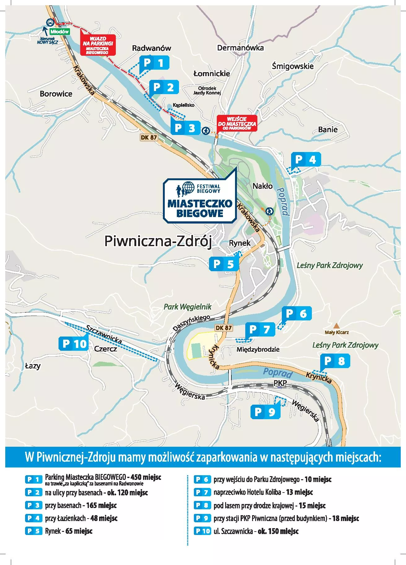 Zawodnicy dobiegną do punktu zwrotnego na szerokiej ścieżce rowerowej przed rondem Jana Pawła II i dokładnie tą samą trasą wrócą do mety na bramie nr 1 w Miasteczku Biegowym na Nakle w Piwnicznej-Zdroju.