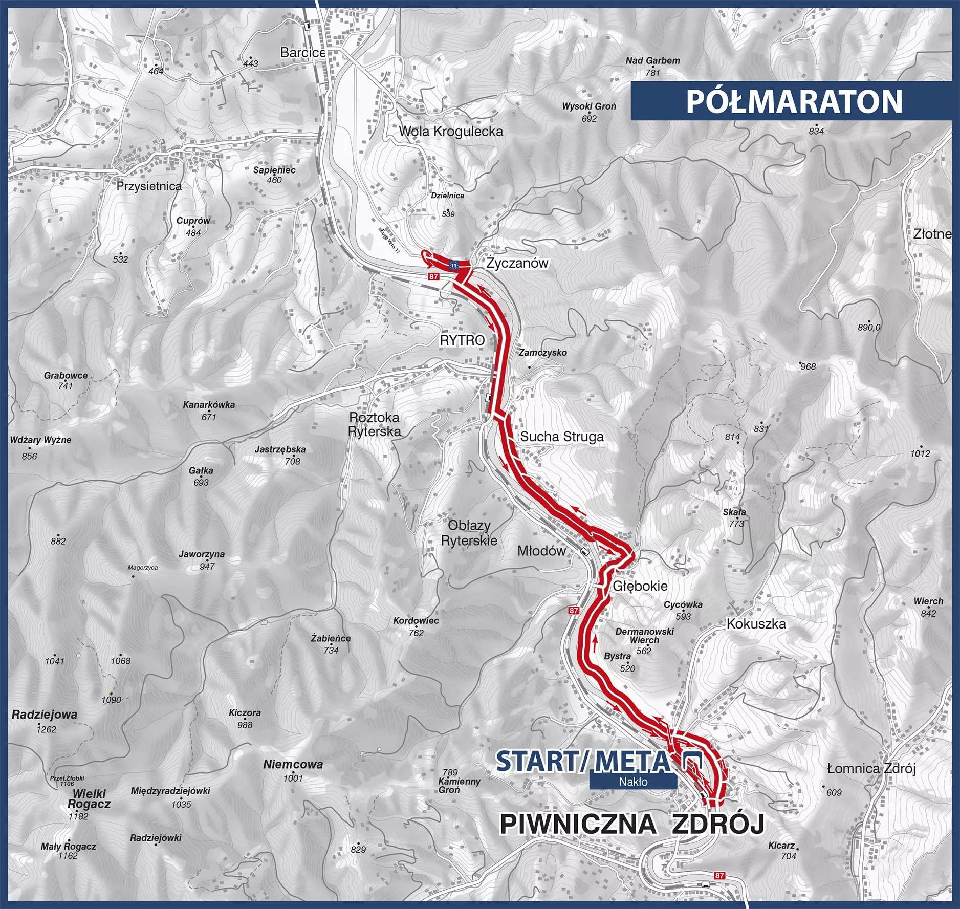 Jak już pisaliśmy, uczestnicy półmaratonu nie będą startowali ze Starego Sącza. Start nastąpi o godzinie 9 z Nakła, potem trasa półmaratonu śladami św. Kingi wiedzie w stronę Barcic i na osiedlu Facimiech, dokładnie między Życzanowem i Barcicami, po przebiegu niecałych 10 km, nastąpi nawrotka. Trasa jest już wyraźnie oznakowana. Zawodnicy zawracają i tą samą trasą biegną do mety.