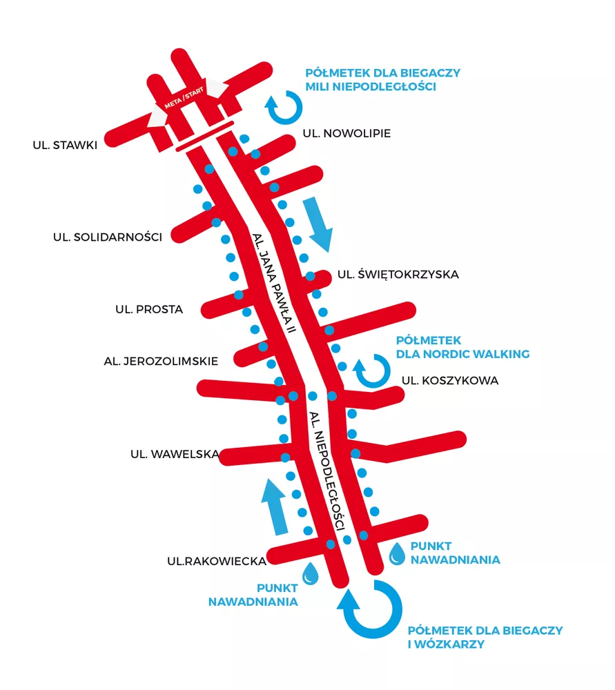 29. Bieg Niepodległości wystartuje jak zwykle o godz. 11:11. Uczestnicy będą mieli do pokonania tradycyjną 10-kilometrową prostą trasę z jedną agrafką, ze startem i metą w okolicach skrzyżowania Al. Jana Pawła II i ul. Stawki. Ruszać będą w 6 falach w zależności od rekordów życiowych.