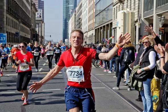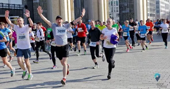 Niedziela 7 rano pobudka, zmiana czasu, plus intensywny dzień poprzedni. Oczy nie chcą się otworzyć. Panowie pojechali metrem na start, ja poszłam pod bramę branderbusrksą ustawić się dużo wcześniej z aparatem. Umówiliśmy się, że biegną lewą stroną. Bałam się, że wśród 31 000 biegaczy przeoczę kolegów.