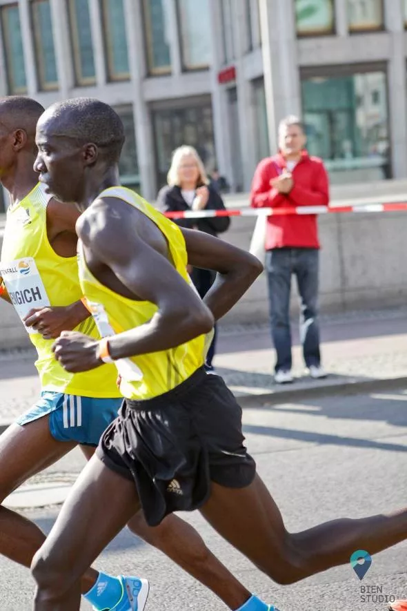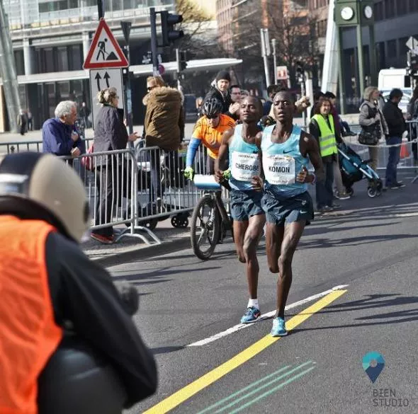 Zmieniłam lokalizację na 16 km trasy, koło Potsdamer Platz. Tam już kibicowała szersza grupa. Fajna atmosfera, biegacze kolorowi. Udało mi się uchwycić w locie Leonarda Komon i Abrahama Cherobena - niesamowici! Przebiegło jeszcze kilkunastu czarnoskórych biegaczy i dopiero biały mężczyzna. Mają niesamowita przewagę.