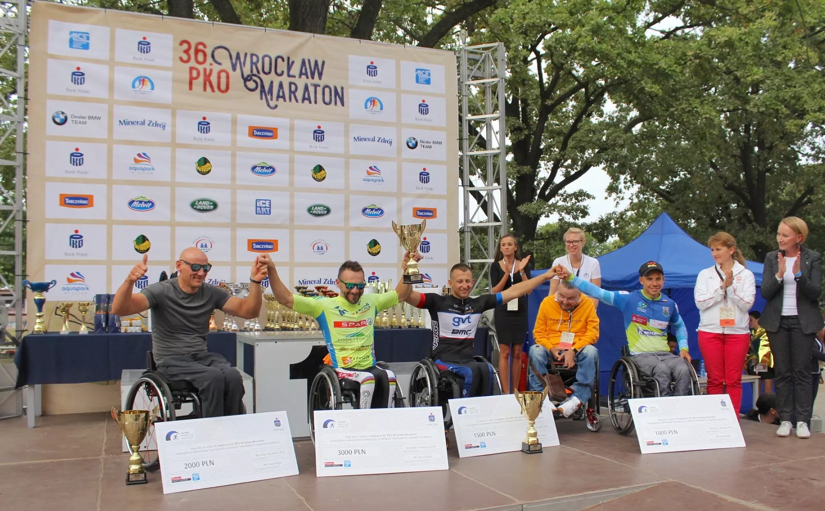 Jako pierwsi stadion opuścili zawodnicy na wózkach z napędem pośrednim – handbike’ach. Najszybszy podczas pętli ulicami miasta był wielokrotny mistrz paraolimpijski i mistrz świata Rafał Wilk. Dystans maratoński ukończył w czasie 1:02:35. Sekundę za nim na metę wpadł – po emocjonującym finiszu – Krystian Giera. Jako trzeci dojechał Tomasz Łyko (1:10:23). Wśród pań wygrała Słowaczka, Anna Orszova (1:16:59), druga trasę pokonała Katarzyna Zubowicz (1:32:24), na najniższym stopniu podium znalazła się Monika Pudlis (1:43:45).