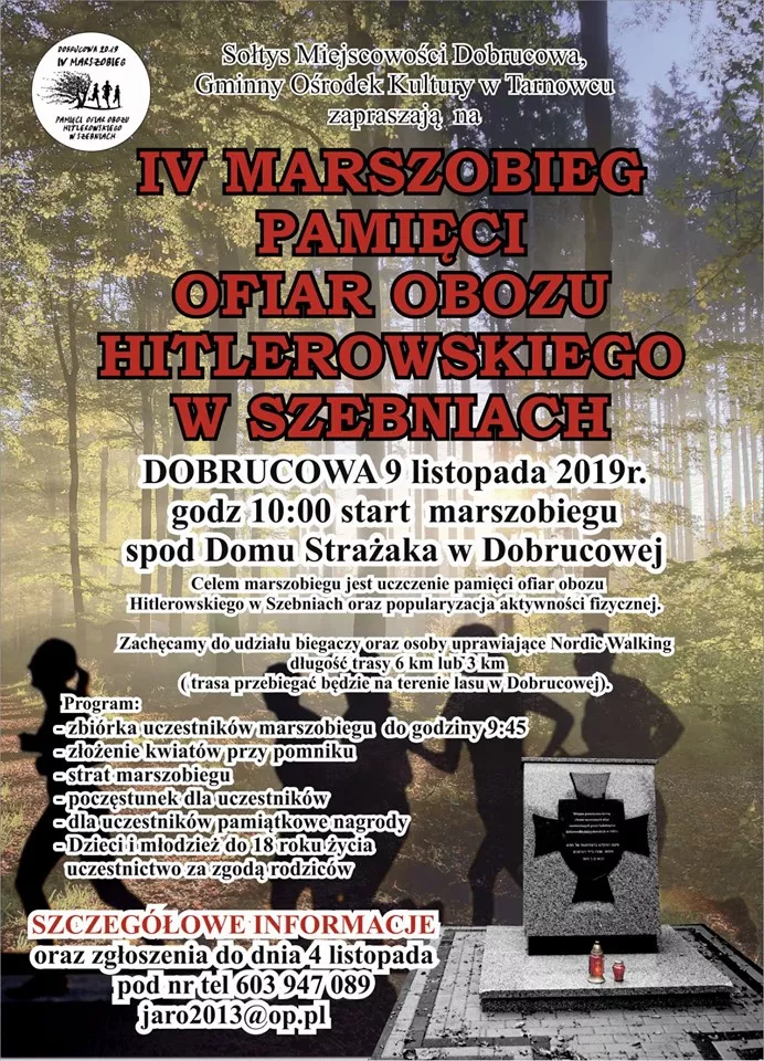 Sołtys miejscowości Dobrucowa oraz Gminny Ośrodek Kultury w Tarnowcu ( powiat jasielski) zapraszają miłośników nordic walking oraz biegaczy na IV Marszobieg upamiętniający ofiary obozu w Szebniach. Impreza w tym roku odbędzie się w sobotę 9 listopada start o godz. 10 spod Domu Strażaka w Dobrucowej.