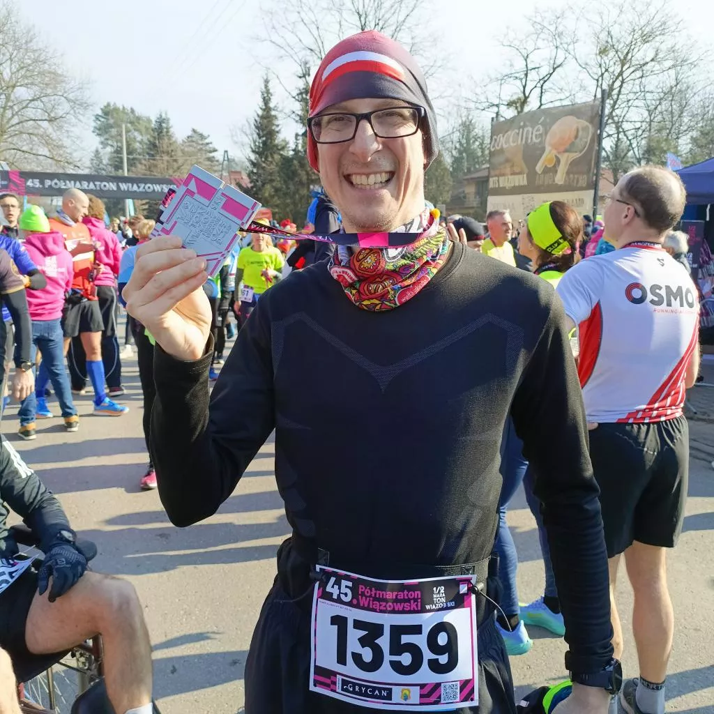 23 lutego odbyła się już 45 edycja półmaratonu w Wiązownej pod Warszawą. Trasa asfaltowa. Start i meta w tym samym miejscu. Tym razem nie wiało jak w latach ubiegłych i naprawdę dobrze się biegło. Tym bardziej, że na starcie zrobiło się ciepło. Teoretycznie 4 stopnie na plusie ale słońce podgrzewało cały czas i temperatura rosła. Mi biegło się dobrze, chociaż nie przygotowałem się zupełnie, ponieważ dostałem pakiet w prezencie. Nie miałem w planach biegać już nic powyżej 10km do lata, no ale cóż... Medale ładne, organizacja imprezy również w porządku, chociaż o tym za chwilę. W szkole dostępne były szatnie, depozyty, stołówki z jedzeniem. Tak, stołówki. Zjeść można było w strefie mety na świeżym powietrzu lub w szkole na sali gimnastycznej, lub w mniejszych stołówkach. Wersja wegańska posiłku była tylko w jednym miejscu ale wystarczyło się spytać w którymkolwiek stoisku wydawania posiłków i już pokierowali gdzie trzeba. Oprócz makaronu z warzywami lub mięsem, była herbata i ciasto. Na mecie dodatkowo woda oraz izotonik plus medal oczywiście.