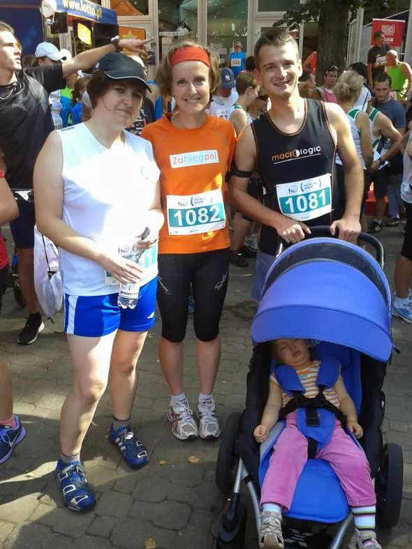 Wystartowaliśmy. Dzięki nachyleniu trasy wózek nie ciążył. Pierwsze 5 km poszło gładko, bo Szkrab był w objęciach Morfeusza. Następne 2 km mała spokojnie się budziła i podziwiała okolice, a od 7 km Grzechu musiał biec i opowiadać bajki, bo ktoś nam się nudził. Przez całą trasę mieliśmy wspaniały doping, więc biegło się naprawdę przyjemnie. Tempo obraliśmy spokojne, by Szkraba nie zmęczyć i by Grzechu był żywy przed jutrzejszym maratonem.