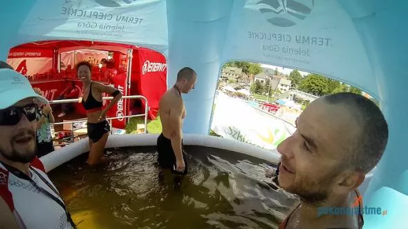 Dystans, przewyższenie i temperatura zrobiły swoje. Ściągam buty i udaję się do jedynej słusznej lokacji - namiotu z basenem wypełnionym lodowatą wodą.