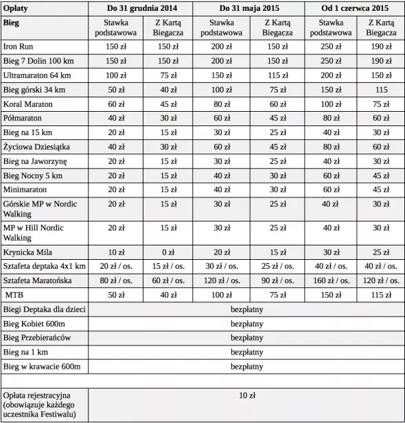 W 3 miesiące na Festiwal zarejestrowało się już ponad 2000 osób. Te, które nie wniosły jeszcze opłaty startowej i rejestracyjnej, a chcą skorzystać z najniższych cen powinny to zrobić do końca grudnia. Od 1 stycznia opłaty startowe na poszczególne biegi wzrosną – i tak np. wpisowe na Koral Maraton rośnie z 60 do 80 złotych, na półmaraton i Życiową Dziesiątkę z 40 do 60 złotych, a na Bieg 7 Dolin ze 150 do 200 złotych.