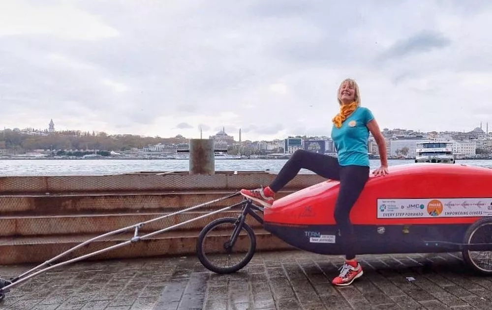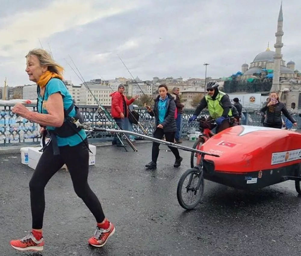 W drogę wyruszyła z Brighton w lipcu zeszłego roku. Nie tak dawno otrzymała urządzenie dzięki, któremu można śledzić jej trasę. Wiadomo, że biegła przez Czechy, Austrię, Węgry, Serbię, a pod koniec października była w Bułgarii. Według jej relacji miała tam za sobą już 1800 mil. Ostatnio minęła Stambuł. Przed nią jeszcze długa podróż po Turcji. Jest to już trzynaste państwo, które przemierza.