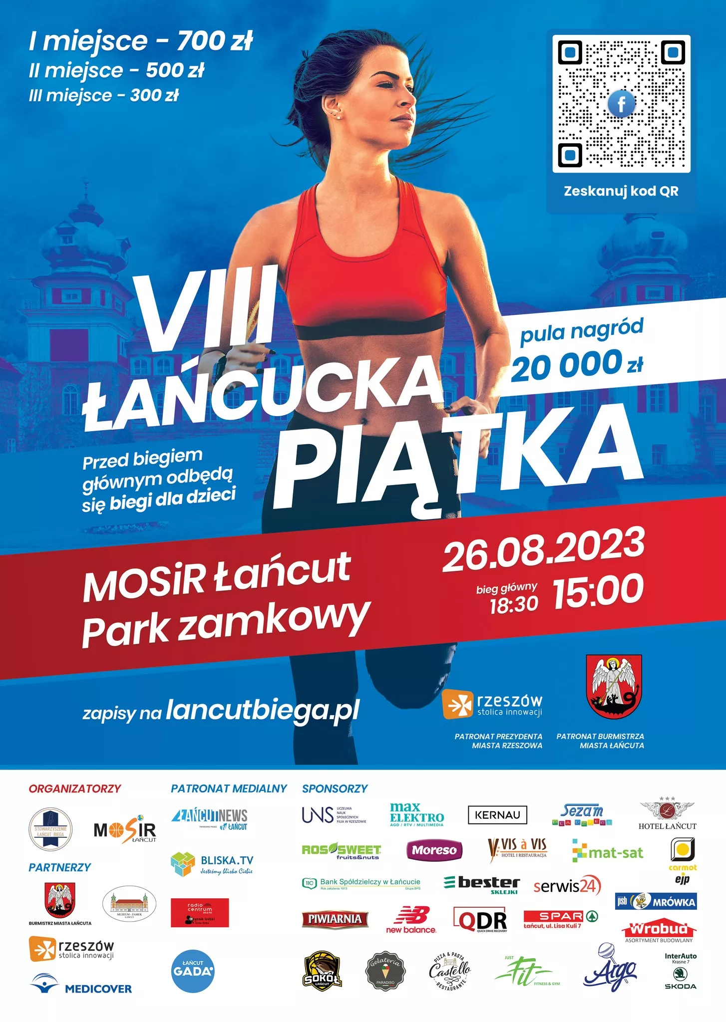 8. Łańcucka Piątka odbędzie się 26.08.2023 w Łańcucie, start biegu głównego o godzinie 18.30. Trasa biegu prowadzi przez malownicze alejki parkowe. Trasa składa się z 2 pętli. Biuro zawodów będzie mieścić się w Miejskim Ośrodku Sportu i Rekreacji w Łańcucie, przy ul. Armii Krajowej 57.