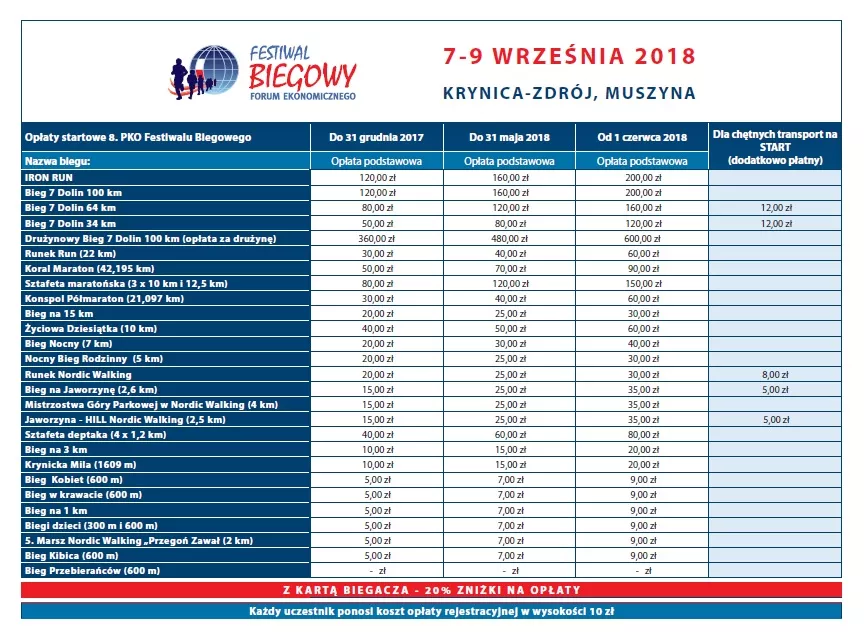 Zachęcamy, by dokonać zgłoszeń jak najszybciej. Warto, bo do końca roku oferujemy Wam najniższe opłaty startowe, których wysokość pozostaje na poziomie roku ubiegłego. Jeszcze taniej będzie z Kartą Biegacza. Można ją bezpłatnie zamówić TUTAJ.