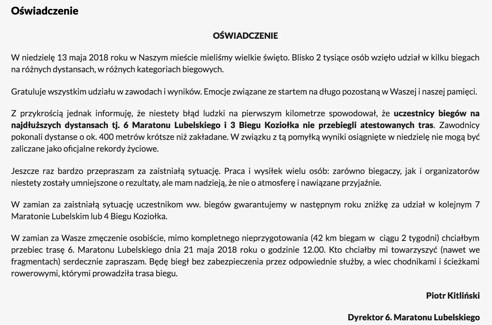 Okazuje się, że trasy w Lublinie choć atestowane, nie miały wymaganej długości. Szczegóły w komunikacie organizatora: