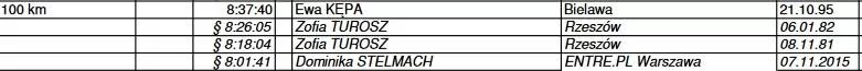 Ubiegłoroczny wynik Dominiki Stelmach z Kalisza nie został uznany za rekord kraju, bo impreza nie została zgłoszona do kalendarza PZLA (koszt 1000 zł). Z kolei wynik Patrycji Bereznowskiej z holenderskiego Deveter nie jest brany pod uwagę przez statystyków PZLA, ponieważ został osiągnięty na bieżni. Jednocześnie PZLA nie uznaje rekordów kraju na 100 000m.