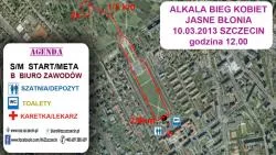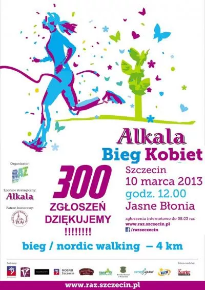 Stowarzyszenie Ruchowa Akademia Zdrowia (RAZ Szczecin) zaprasza wszystkie kobiety na czwartą edycję Biegu Kobiet. Ze względu na pozyskanie sponsora strategicznego, tegoroczna edycja imprezy nosi nazwę Alkala Bieg Kobiet. Zawodniczki mają do wyboru udział w Biegu Kobiet lub marszu Nordic Walking na dystansie 4 km. Start i meta biegu znajdują się na Jasnych Błoniach w Szczecinie. Rozpoczęcie Biegu Kobiet zaplanowano na godzinę 12:00, a marszu Nordic Walking na 12:30. Lista startowa tegorocznego biegu obejmuje rekordową ilość zapisanych Pań – 568. Zapisy internetowe zostały już zamknięte. W przypadku posiadania wolnych numerów startowych zgłoszenia będzie można dokonać od 09 - 10 marca 2013 w biurze zawodów – 40zł (50 % zniżki dla zawodniczek Ruchowej Akademii Zdrowia). Pakiet startowy zawiera numer startowy i koszulkę techniczną. Pomiar czasu dokonany będzie przy pomocy elektronicznych chipów. Wszystkie uczestniczki po ukończeniu biegu otrzymają pamiątkowy medal, a wszystkie osoby, które ukończą bieg/marsz wezmą udział w losowaniu wielu nagród - niespodzianek.