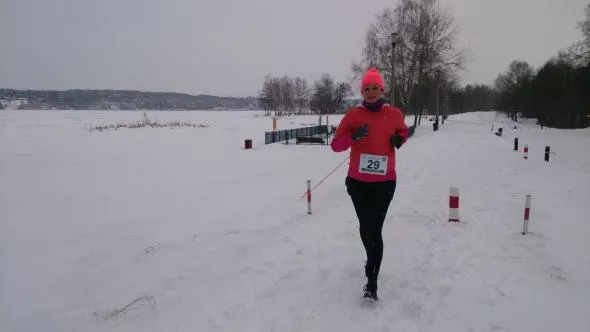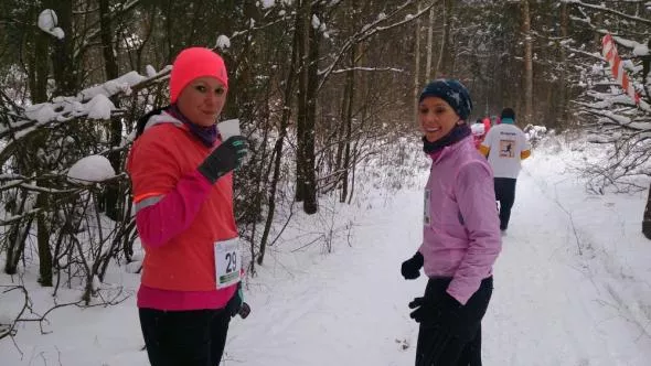W niedzielny poranek przyszedł do mnie sms. Kinga z nadzieją patrzyła jak go odczytuję – może Paulina się rozmyśliła? A tu zaskoczenie – o umówionej godzinie po Nas podjeżdża! :) Na drogach był koszmar bo nic nie odśnieżone i się prawie spóźniliśmy na bieg a śnieg nadal sypał. Na szczęście Michał odebrał Nam pakiety wcześniej. Droga do zapory w Dębe wyglądała jak z bajki. Krajobraz przypominał górską serpentynę zasypaną śniegiem – coś niesamowitego. Na miejscu zawodów kolarze już kończyli swoje zmagania (mieli do przejechania 2 okrążenia po tej samej trasie) a biegacze nieśmiało się rozgrzewali. W szkole, która była bazą tłum ludzi, wszyscy uśmiechnięci - sam fakt, że pokonali lenia i przyjechali w taka pogodę w niedzielny poranek zamiast leżeć w wyrku jest sukcesem. Spotykamy ekipę z Chotomowa oraz Jacka i Anetę. Szybka przebierka, fotka zrobiona przez ratownika medycznego i już jesteśmy na trasie.