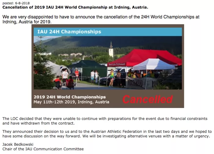 Przyszłoroczne Mistrzostwa Świata w biegu 24-godzinnym stanęły pod znakiem zapytania. Impreza miała odbyć się Irding, w dniach 11-12 maja, ale Austriacy zrezygnowali z organizacji wydarzenia.