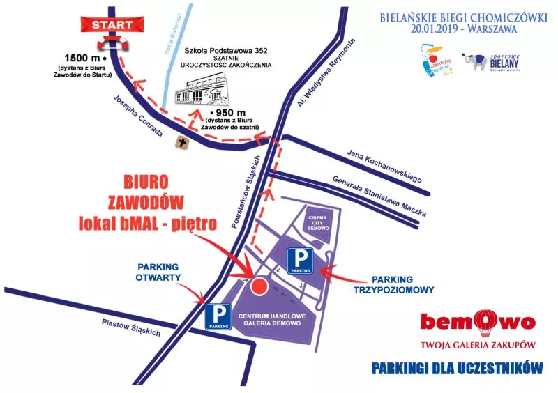 – Medale wiemy jak wyglądają, czekamy na dostawę, koszulki i worki są już u nas, numery w druku – wylicza szefowa imprezy. Biuro zawodów będzie zlokalizowane po raz pierwszy w Centrum Handlowym „Galeria Bemowo” przy ul. Powstańców Śląskich, która w dniu zawodów udostępni biegaczom swój parking. Pakiety startowe można odbierać w piątek 18 stycznia w godz. 14:00-20:00 i w sobotę 19 stycznia w godz. 12:00-20:00, a w dniu biegu od godziny 7.