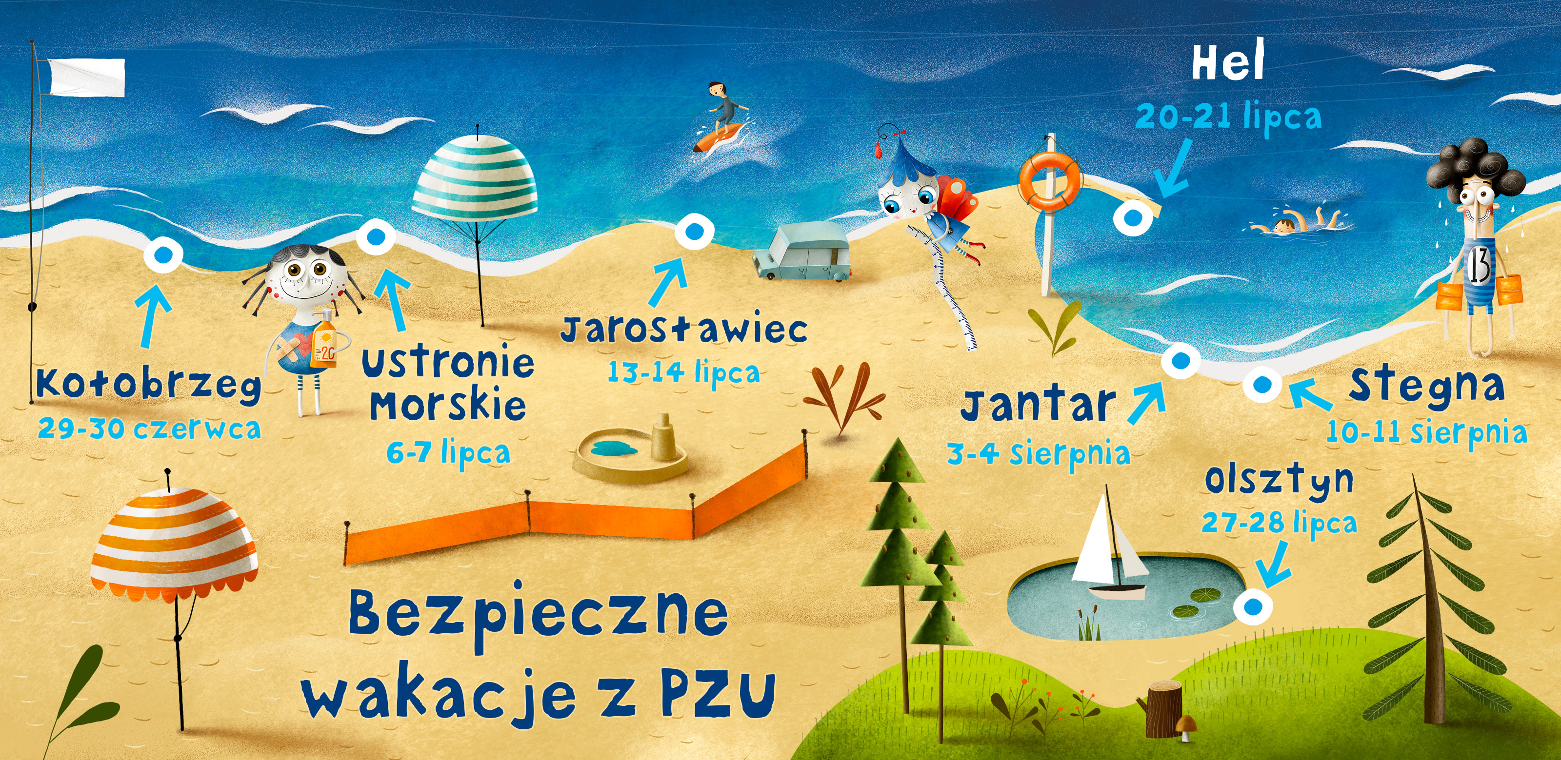 PZU razem ze Słoneczną Stacją Polsatu będą uczyć dzieci i rodziców, jak bezpiecznie zachowywać się w różnych sytuacjach i jak przeciwdziałać zagrożeniom podczas wakacji. W ramach akcji „Bezpieczne wakacje z PZU” w sześciu nadmorskich miejscowościach oraz na Warmii zostaną zorganizowane specjalne wydarzenia. Inauguracja cyklu rozpocznie się 29 czerwca w Kołobrzegu a zakończy w drugi weekend sierpnia w Stegnie.