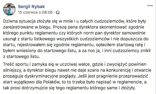 „Treść sportu i zamyka się w uczciwej walce, gdzie i zwyciężyć powinien silniejszy, a dyrektor biegu nawet nie daje szans na konkurencję i otwarcie propaguje dyskryminacyjne poglądy” - pisał dalej biegacz z Winnicy, oskarżając organizatorów o nieprzestrzeganie regulaminu i dyskryminację obocokrajowców.